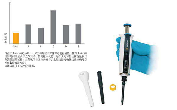 Tacta是市場上清潔起來最快且最方便的移液器,只需拆卸三個部件即可清潔,而且拆卸操作無需使用工具