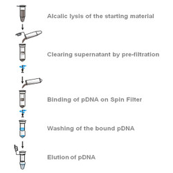 For the fast and direct isolation of plasmid DNA from 250 µl of a bacteria suspension. The kit doesn‘t need the pelleting of bacteria cells and starts directly with the bacterial suspension. The kit allows the isolation of 1 – 4 µg plasmid DNA. |
