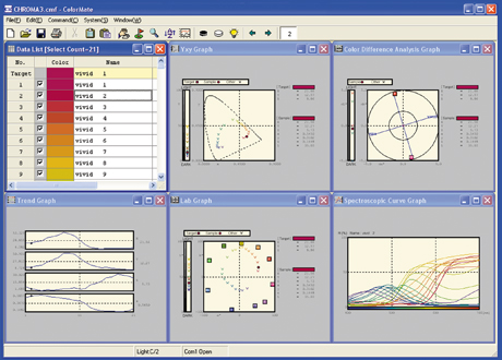 | Color Mate has a cooperative software with all kinds of instruments which is useful for analyzing and managing the measurement data. It is possible not only to display the data of measurement, spectroscopic curve, Lab graph, Yxy graph, color deviation criterion chart, trend graph and spectral data, but also to caluculate standard variation, maximum value, minimum value and average value without depending on commercial-release software. |