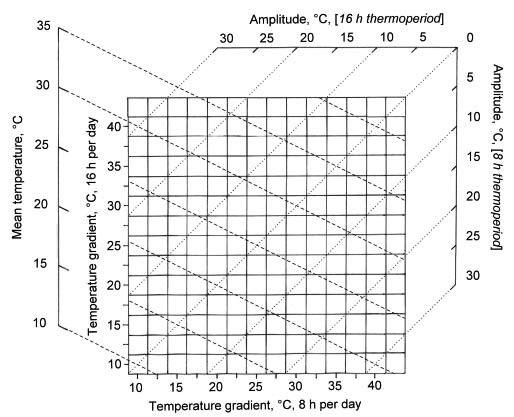 在一天內(nèi)一部分時間對單一方向進(jìn)行溫度梯度循環(huán),在另一段時間進(jìn)行直角方向溫度梯度的循環(huán),同時提供了196個不同的熱能環(huán)境。對于持續(xù)以及變化的2種溫周期的溫度幾種量化結(jié)果