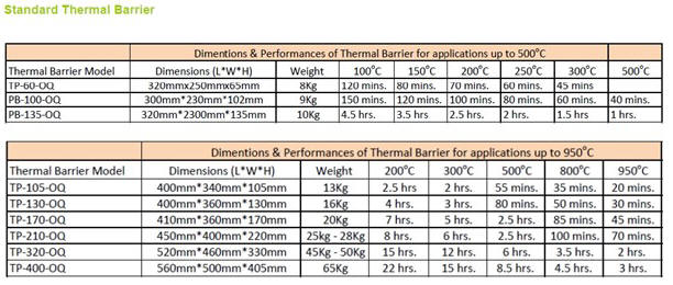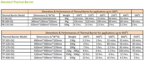 The performance of a thermal barrier is measured in terms of the exposure time at a particular temperature for a given maximum internal temperature. The performance is closely related to the barrier's insulation thickness. The table below indicates the allowable exposure time (in minutes) of temperatures for the standard (thermal barrier models assuming a maximum internal temperature of 70°C).