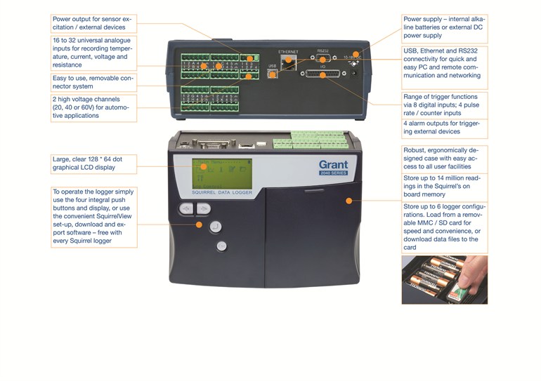 Twin processors, multiple 24-bit A to D converters, up to 32 universal channels, removable Multi Media (MMC) or SD card memory and a choice of communications methods ensure that the Squirrel 2040 series provides state-of-the-art data logging and communication capability for sophisticated applications needs.