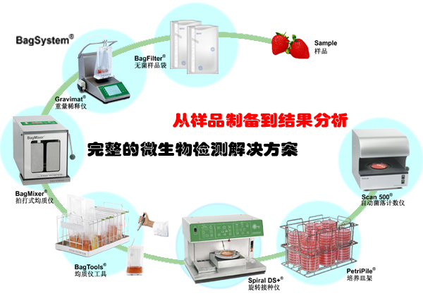 完整的產(chǎn)品系列為現(xiàn)代細菌總數(shù)檢測實驗室提供了全面的解決方案,樣品經(jīng)放入BagSystem無菌樣品袋,在Gravimat重量稀釋器進行適當(dāng)倍數(shù)的稀釋,在BagMixer拍打式均質(zhì)儀上破碎混勻,用BagPipet取出樣品溶液,用Spiral DS+旋轉(zhuǎn)接種儀將樣品接種到培養(yǎng)平板表面上,樣品經(jīng)孵育培養(yǎng)后,再采用Scan 300或Scan 500或Scan 1200自動菌落計數(shù)儀對培養(yǎng)平板表面上的細菌進行自動計數(shù),從而完成對細菌總數(shù)的檢測。該方法解決了細菌檢測中的樣品制備、接種和計數(shù)等問題,為細菌總數(shù)檢測提供了完整的解決方案。
