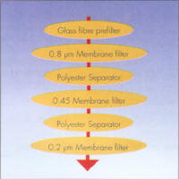 當過濾較粘稠難過濾的液體,如血清等,通常采用多層過濾法,如下圖所示,2-3層不同孔徑的過濾膜疊放,過濾膜間加聚酯分隔層(產品編號:13420)以便于液體濾過,最上層加玻璃纖維預濾膜。