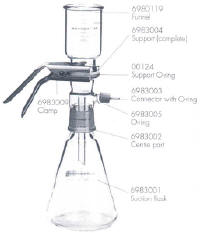 硼硅玻璃漏斗,抽濾組件和抽濾瓶,玻璃濾膜支撐墊,PTFE保護墊圈,45x3mm的氟橡膠密封圈,經(jīng)電鍍處理的鋁質(zhì)夾子,聚丙烯軟管接口(7.5mm外徑)