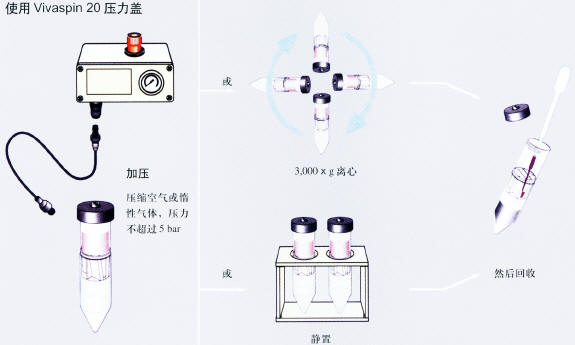 當(dāng)沒有離心機(jī),或只處理一個(gè)樣品時(shí),可采用這種方法。在Vivaspin 20中加入不超過15ml的樣品,加壓后靜置,即可達(dá)到超濾濃縮的目的。