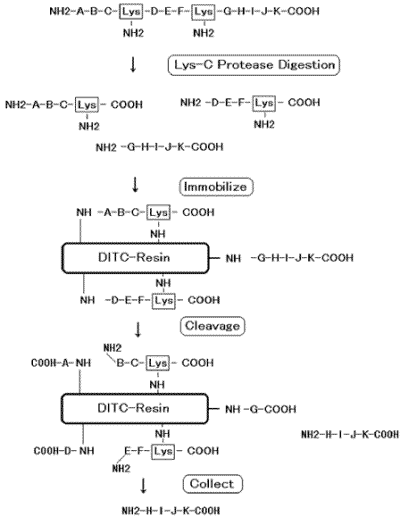 對目的蛋白質(zhì)或多肽采用賴氨酸肽鏈內(nèi)切酶消解,將消解產(chǎn)物直接送入DITC柱內(nèi),分餾儀將自動的對其加熱,將各多肽片段的N-末端的α-氨基酸和賴氨酸(Lys)殘基的ε-氨基酸共價結(jié)合固定在DITC樹脂上,用三氟乙酸(TFA)將固定住的各片段中的N-末端的肽鏈結(jié)合的α-氨基酸裂解,將釋放出的C-末端片段收集。