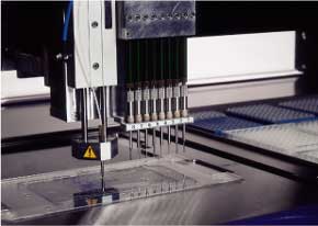 切割下來的凝膠,進(jìn)行清洗、脫色、脫水和酶消解后,對消解的多肽進(jìn)行提取,脫鹽,添加基質(zhì),移送到MALDI-TOF-MS的樣品靶板上,該過程全部自動完成。(脫鹽采用ZipTip(R),Millipore產(chǎn)品) |
