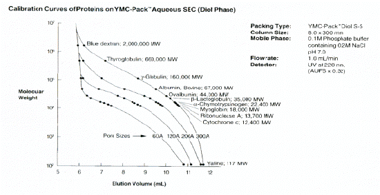 SEC),具有較高的壓力耐受性,低成本的凝膠分離色譜柱(Gel Filtration Chromatography, GFC),主要用于蛋白質、多肽和糖類化合物的分子量測定,很小的二級相互作用;適用的pH范圍為5.0~7.5,Diol-120型,Diol-200型和Diol-300型,其孔徑分別為120Å,200Å和300Å,適合于分子量一萬到幾百萬的蛋白質分離和測定;Diol-60型的孔徑為60Å,更適合分子量在一萬或更低的多肽或寡聚糖類的分離和測定。 |