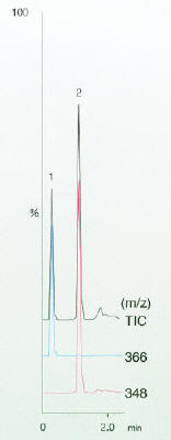 左圖為采用LC/MS卡套柱分離抗生素,由于柱長度較短和反壓低,LC/MS卡套柱可在高流速下進(jìn)行。圖中顯示2分鐘即可達(dá)到對被測物的完全分離,并且峰形良好。