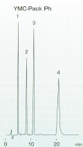 下圖顯示了在不同烷基鏈長度的固定相對苯并[9,10]菲(一種限制性轉(zhuǎn)動的平面分子)的分離行為。苯并[9,10]菲在C4柱上相對于C8和C18而言,比預(yù)期的以疏水性為基礎(chǔ)的固定相相比具有更短的保留時間。 注意對苯并[9,10]菲的出峰順序不同在這幾種固定相與鹽酸丙咪嗪和戊苯有關(guān)。
