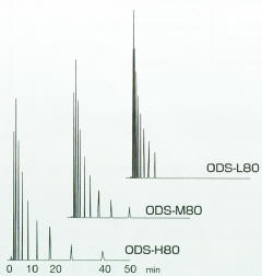 ODS-L80:碳含量9%,保留時間類似于YMC-Pack C8,但由于有高的氫鍵鍵合能力,其選擇性非常均勻。
