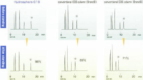 當(dāng)普通的ODS色譜柱在100%的水相流動相中使用時,由于水相和填料表面的疏水基團(tuán)相互排斥作用,ODS色譜柱的疏水性明顯減低,使餾出物的保留減低。如上圖例中,色譜柱在100%水相流動相中停留并過夜,比較 在過夜前和過夜后對核酸堿基分析的保留時間,腺嘌呤在過夜后分析的保留時間,其它產(chǎn)品(Brand Ⅱ)顯示為在原來基礎(chǔ)上降低89%,其它產(chǎn)品(Brand Ⅲ)顯示為在原來基礎(chǔ)上降低71%,而Hydrosphere C18的保留時間則可達(dá)到98%。Hydrosphere C18色譜填料設(shè)計為顆粒表面保留一定的親水性,所以可實現(xiàn)水合作用。當(dāng)Hydrosphere C18色譜柱用在含非有機(jī)溶劑流動相時,其保留時間不一定能夠有效的縮短,但是,其色譜分離的結(jié)果可達(dá)到非常高的再現(xiàn)性。
