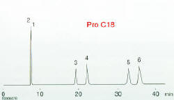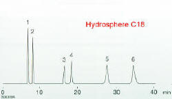 上圖顯示了采用不同的色譜柱分離含有不同特性的混合樣品的分離狀況比較,Hydrosphere C18色譜柱與Pro C18色譜柱相比,具有更高的親水性和低的密度,其結(jié)果是縮短了疏水化合物的保留時間,包括n-丙苯和n-丁苯,以及如雙相化合物苊;而與此相反,具有大量氫基鍵合相特性的睪丸激素在Hydrosphere C18色譜柱與同樣具有高親水性表面的其它產(chǎn)品(Brand Ⅳ)相比,其保留時間更長。