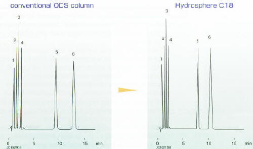 由此顯示了Hydrosphere C18色譜柱與常規(guī)多用途的ODS色譜柱有著不同的分離特性,所以Hydrosphere C18色譜柱常用于分離在普通ODS不能很好分離的化合物。